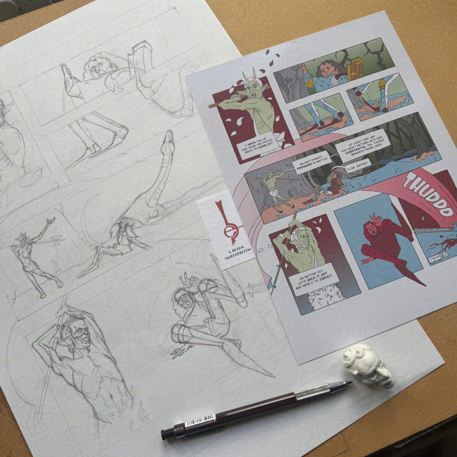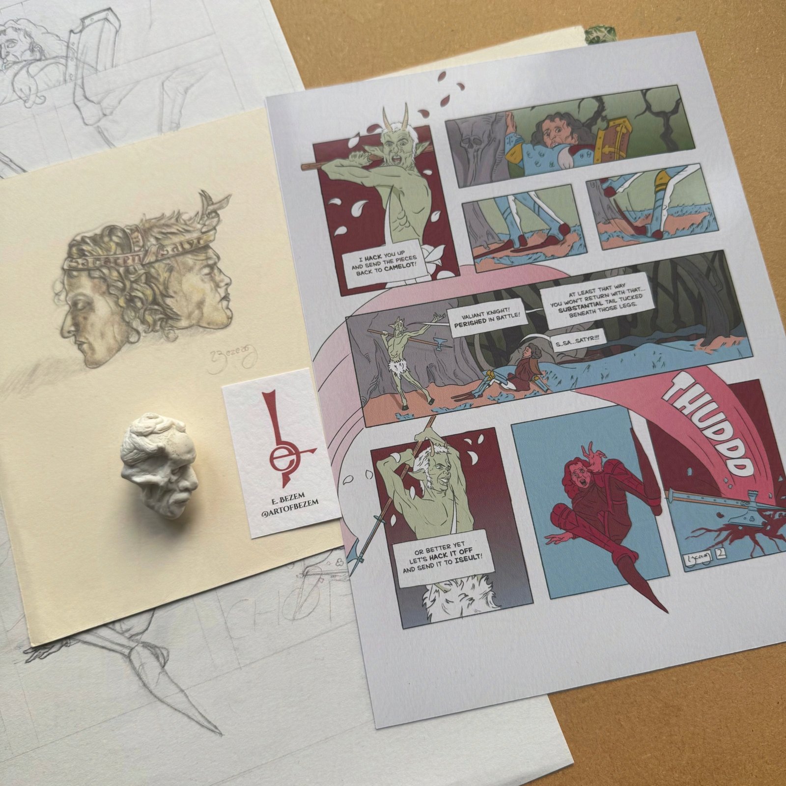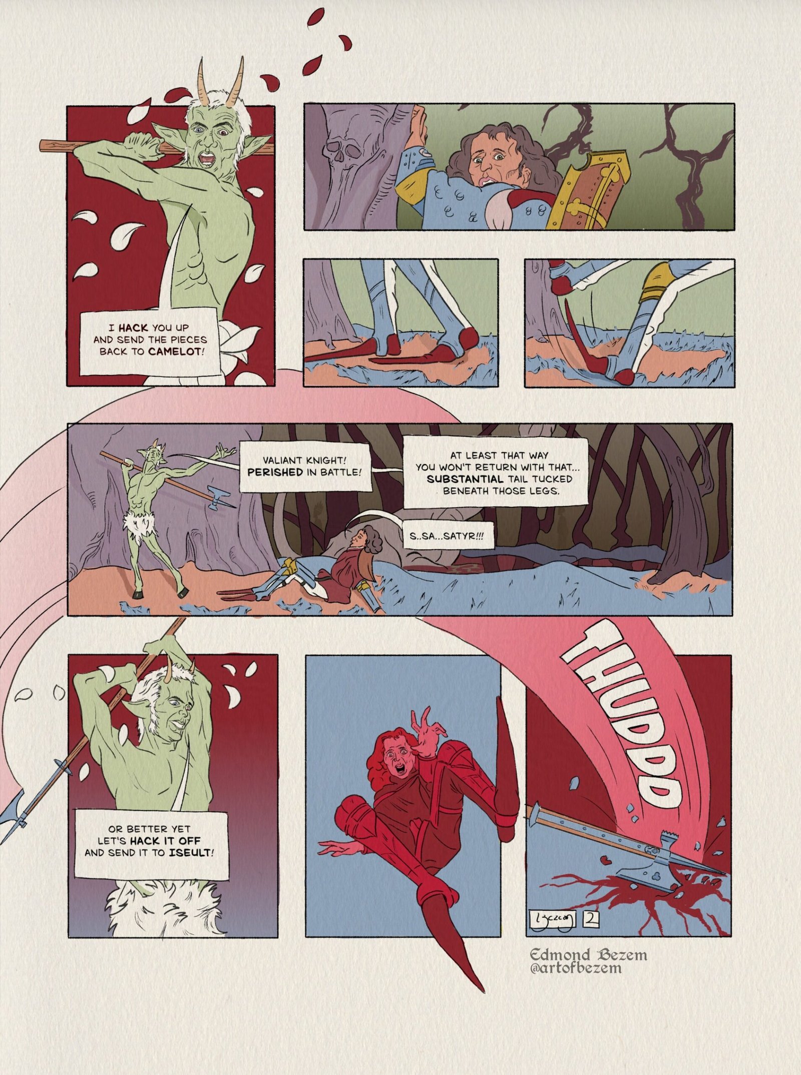 In Saracen and Satyr, he is accompanied (begrudgingly) throughout his endless task with a companion, a child of Pan and endless thorn in the side of grim Knight.